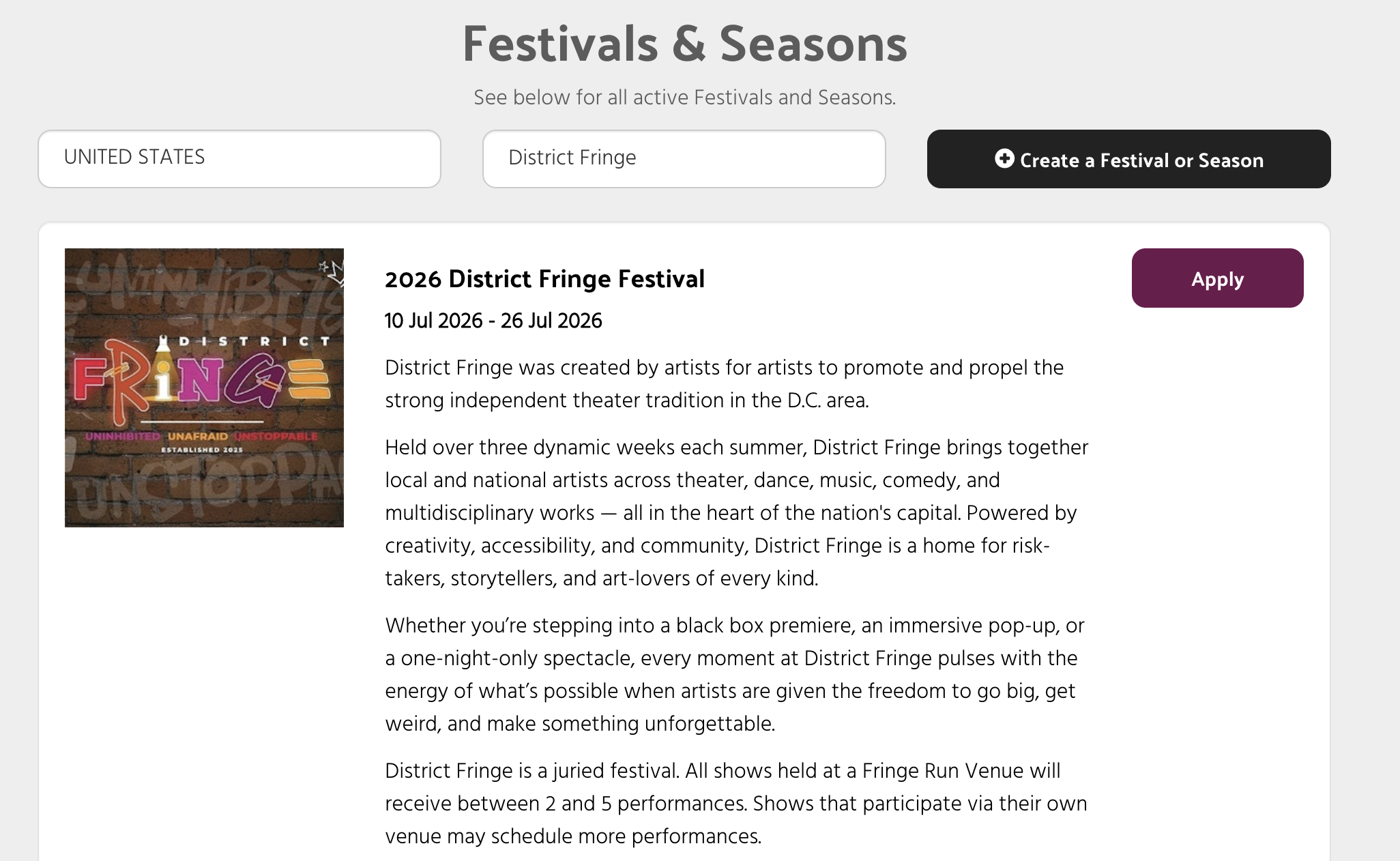 Find the “2026 District Fringe Festival” and click on the “Apply ” button.